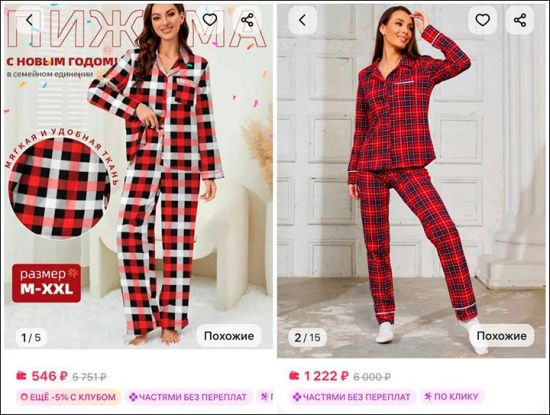 Слева китайская пижама, справа - русская. Разница в цене не нуждается в комментариях.// Скриншот из приложения "Вайлдберриз"